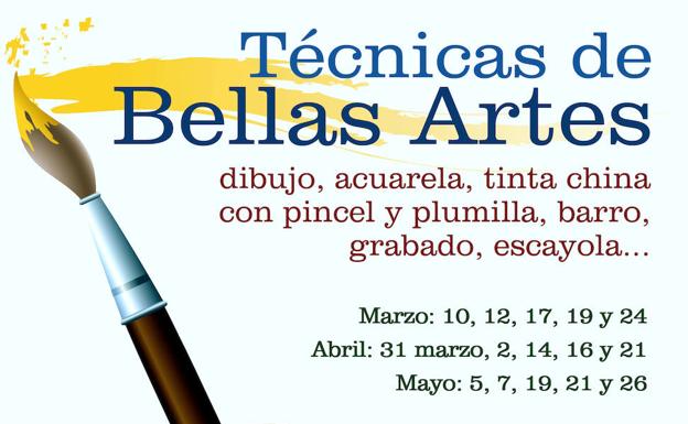 Técnicas de Bellas Artes son tres talleres de 10 horas de duración que se desarrollan en los meses de marzo, abril y mayo, impartido por Carmen Goga. El precio de cada taller es de 20€ y el horario será de 19,00 a 21,00 horas.