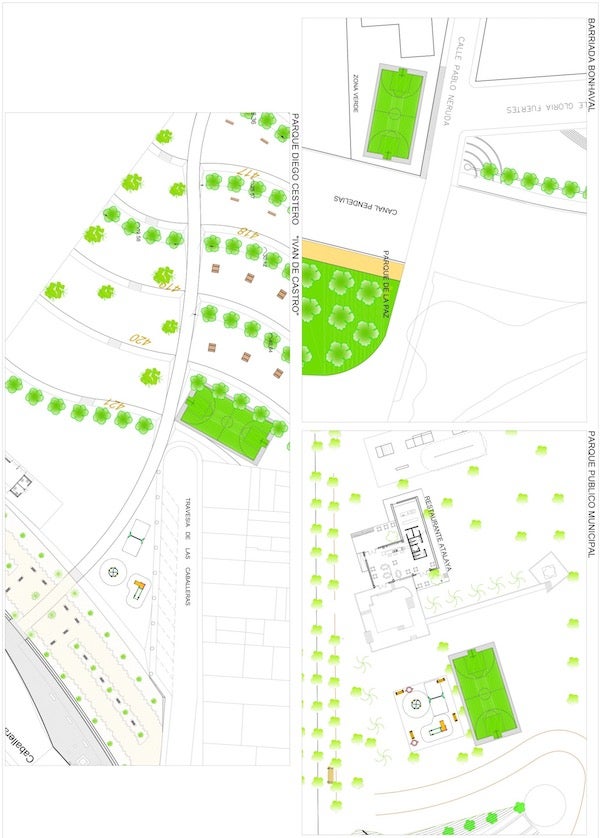 El Ayuntamiento ha previsto también la construcción de 3 pistas polideportivas para las barriadas de Bonhaval, Las Peñitas y La Coronada, que viene a cubrir todo el municipio puesto que con anterioridad se había instalado otras dos en El Pilar (justo frente al colegio). La inversión total asciende a 87.000 euros. La pista de Bonhaval irá justo al lado de la estructura que está pendiente de derribo (en la intersección de la Harinera con Las Pasarelas), la de Las Peñitas irá en el Parque de Iván de Castro y la de La Coronada se construirá en el Parque Público.