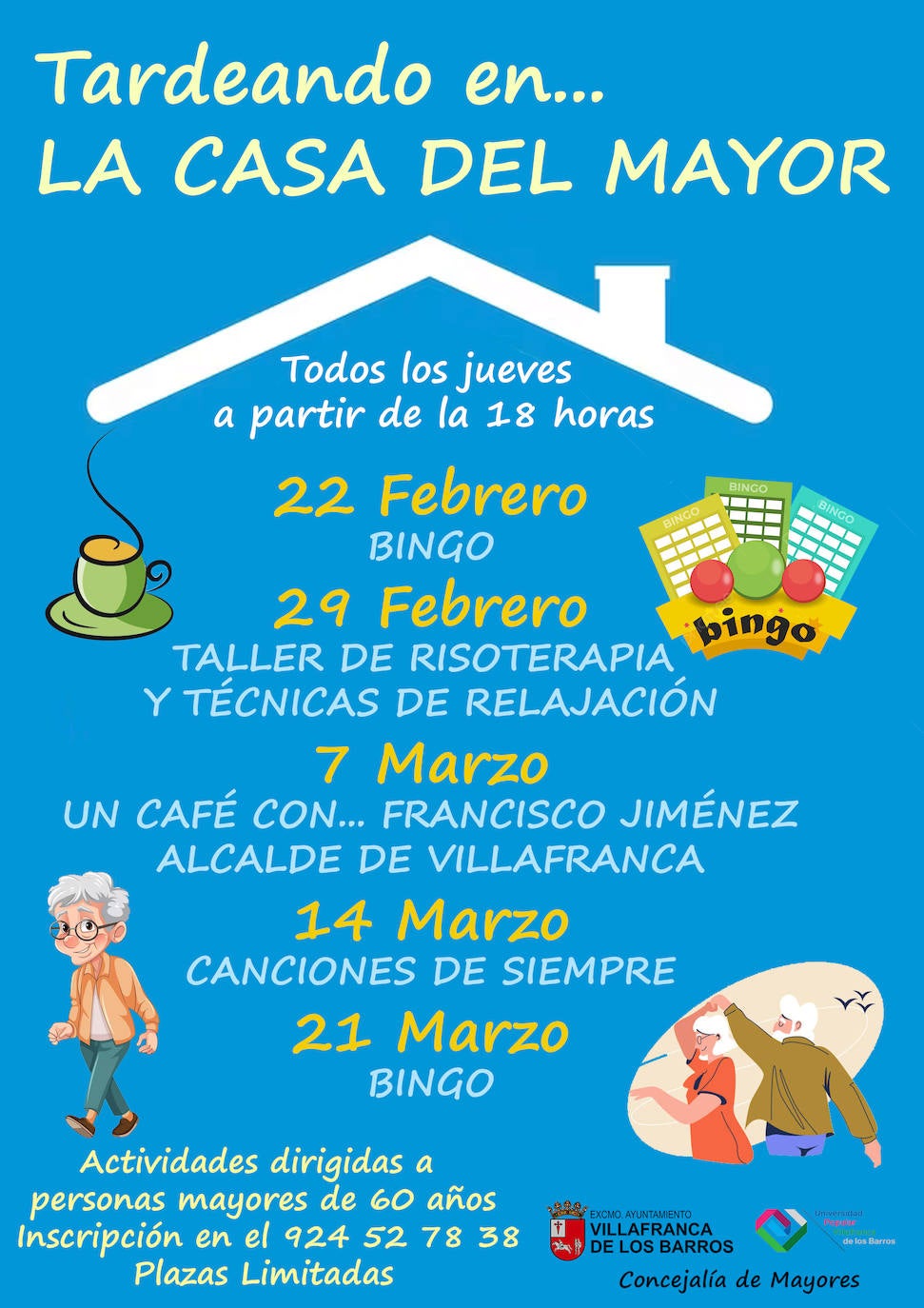 Destinadas al entretenimiento y la diversión de las personas mayores con las que se pretende atraer y motivar a la participación de este colectivo también por las tardesLa concejalía de Mayores del Ayuntamiento de Villafranca de los Barros presenta el programa de actividades que comprende «Tardeando en… la Casa del Mayor» desde el pasado jueves 22 de febrero hasta finales de marzo.