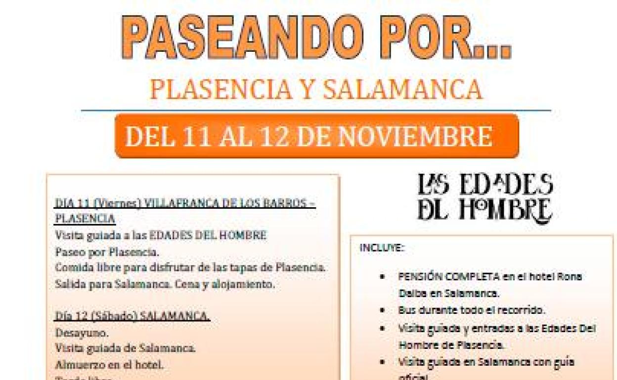 El precio por persona es de 120 euros e incluye pensión completa en el Hotel Dona Dalba en Salamanca, bus, visitas guiadas a 'Las Edades del Hombre' en Plasencia, y la visita guiada de SalamancaLa concejalía de Mayores del Ayuntamiento de Villafranca de los Barros lanza una nueva entrega de 'Paseando por…', en esta ocasión por Plasencia y Salamanca para el 11 y 12 de noviembre.