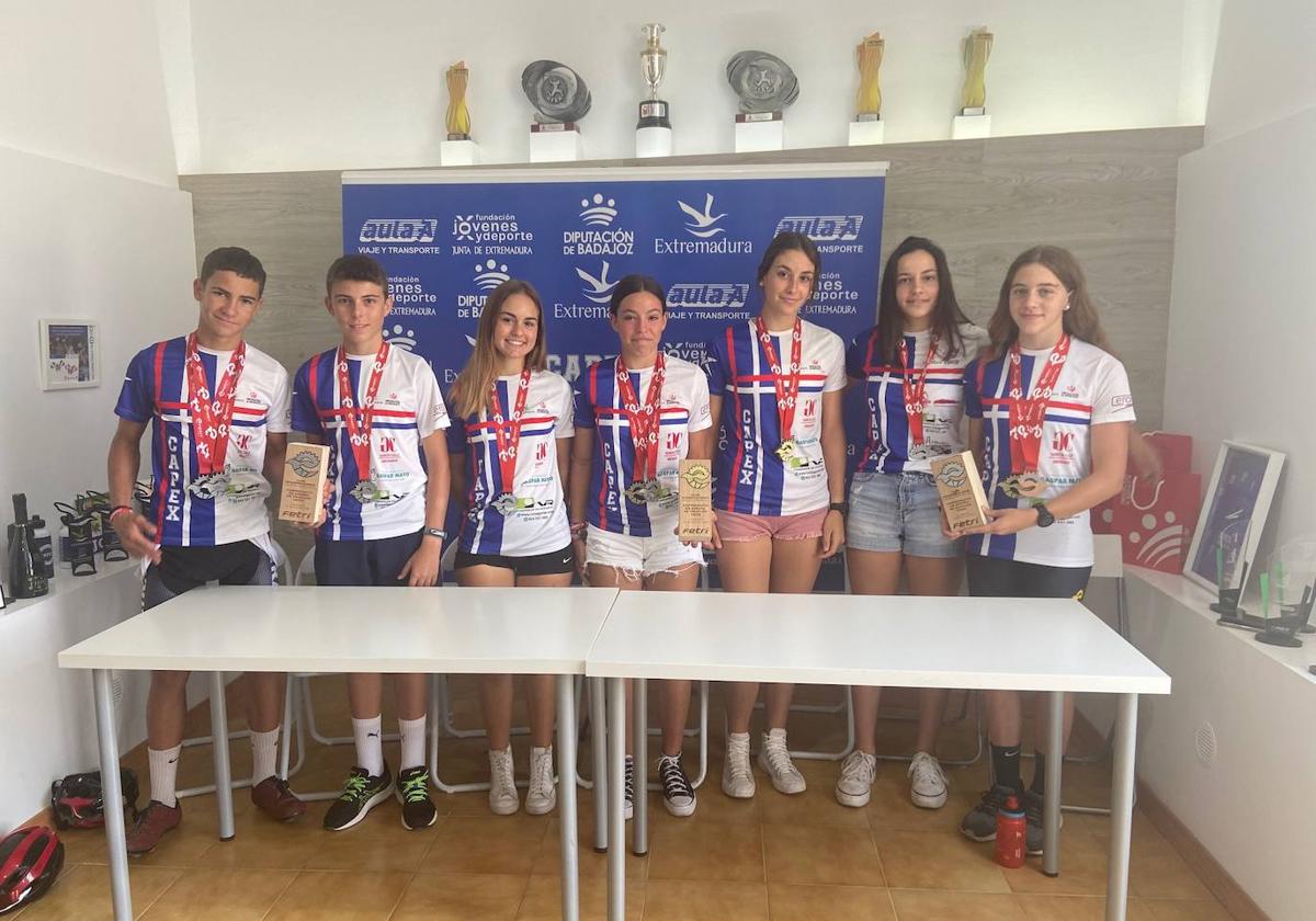 El presidente del Capex, Jesús Nieto, el director deportivo de Triatlón, José Joaquín Castro, y los triatletas que participaron del campeonato, Pedro Luis Cumplido, Celia Pinilla, Miriam Zafra, Cristina Acedo, Lucía Castro, Marta Burguillos y Daniel Castro, ofrecían una rueda de prensa para trasladar las sensaciones que tuvieron durante la competición.