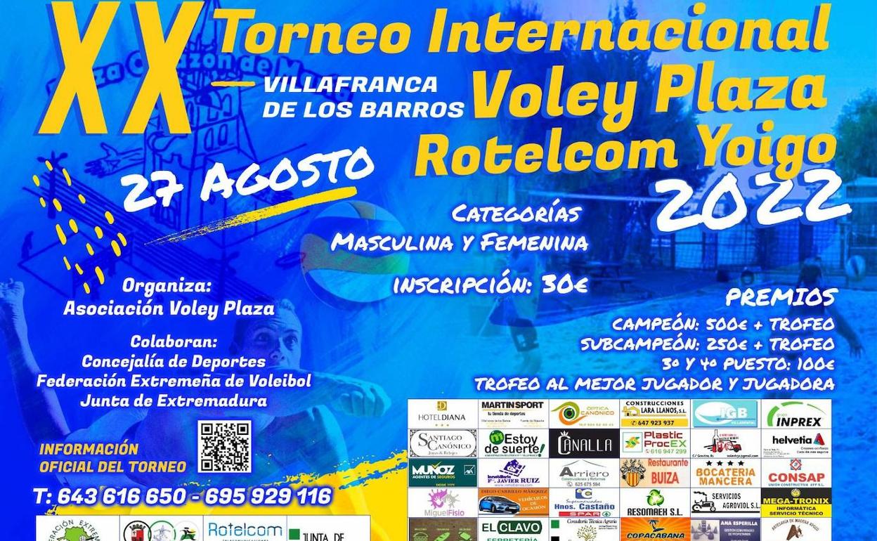 Después de varios años de parón, la Asociación Voley Plaza, de Villafranca de los Barros, retoma la organización del primer torneo de verano de Extremadura, y lo hace en su vigésima edición. El XX Torneo Internacional Voley Plaza Rotelcom Yoigo comenzó a celebrarse en 1999, y durante muchos años fue el referente de los torneos extremeños y el pistoletazo de inicio para la siguiente temporada.