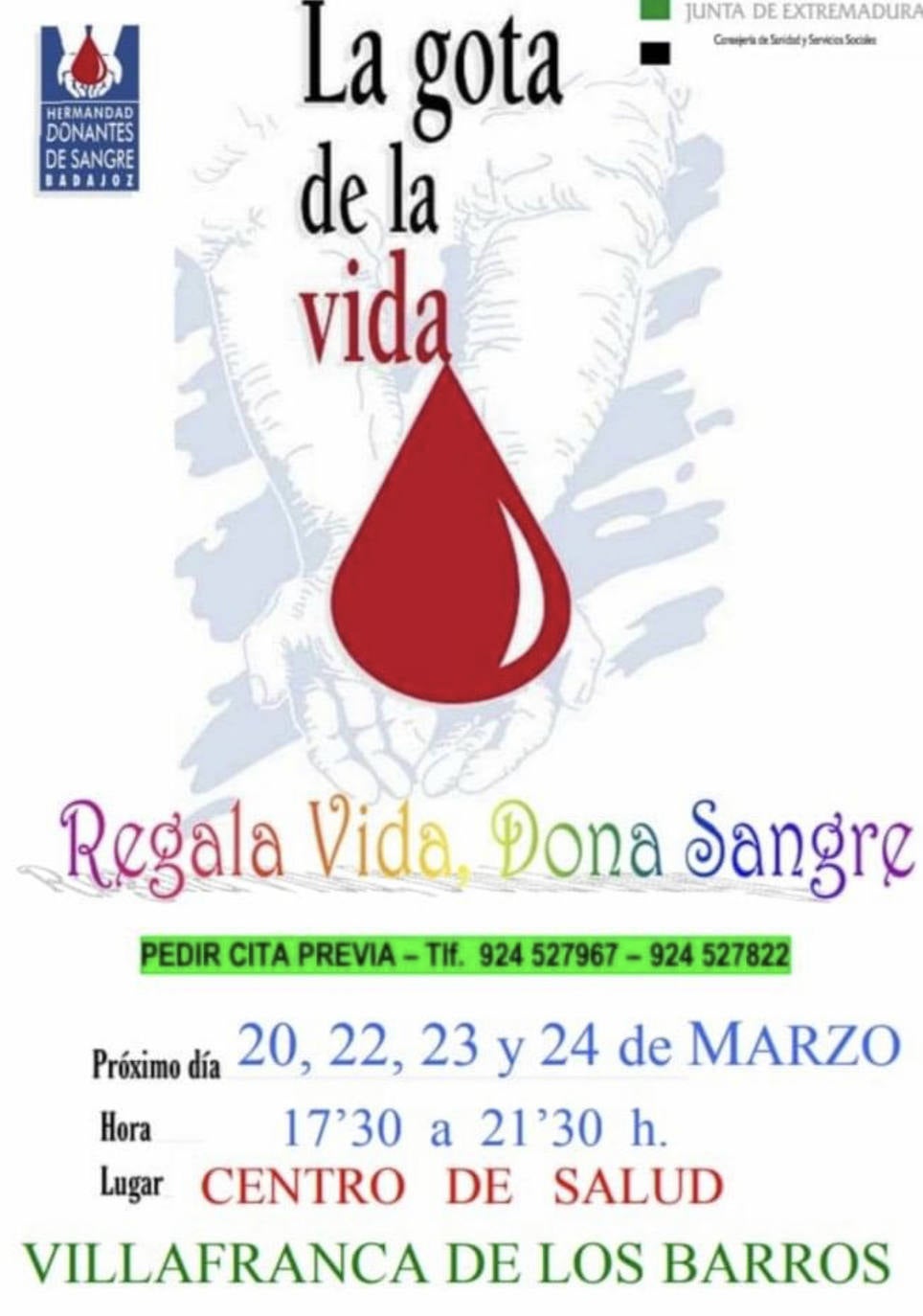 Los días 20, 22, 23 y 24 de marzo se podrá sonar sangre en el Centro de Salud de Villafranca de los Barros. Las horas disponibles son de 17:30 a 21:30 horas.