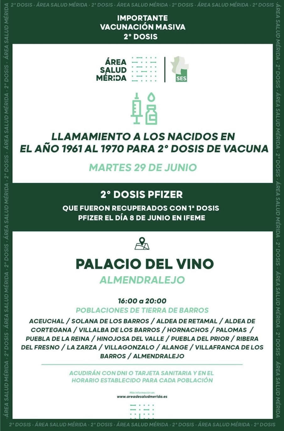 Desde el Área de Salud de Mérida se hace un llamamiento a los nacidos del año 1961 al 1970 para la 2º dosis de la vacuna Pfizer, que fueron vacunados ya el día 8 de junio en IFEME.