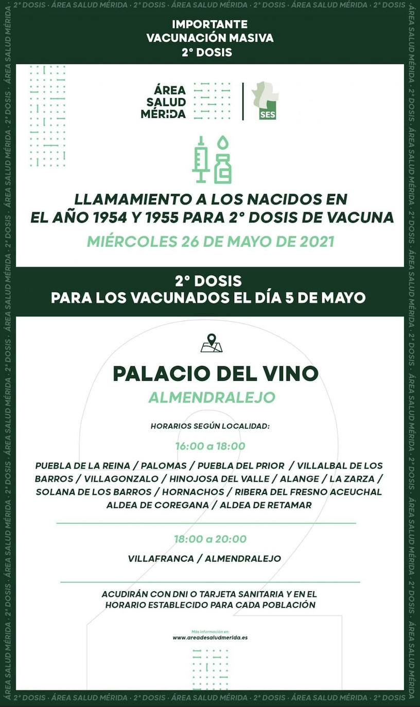 Los vecinos de Villafranca podrán acudir el miércoles 26 de mayo en el horiario de 18:00 a 20:00 en el Palacio del Vino de Almendralejo