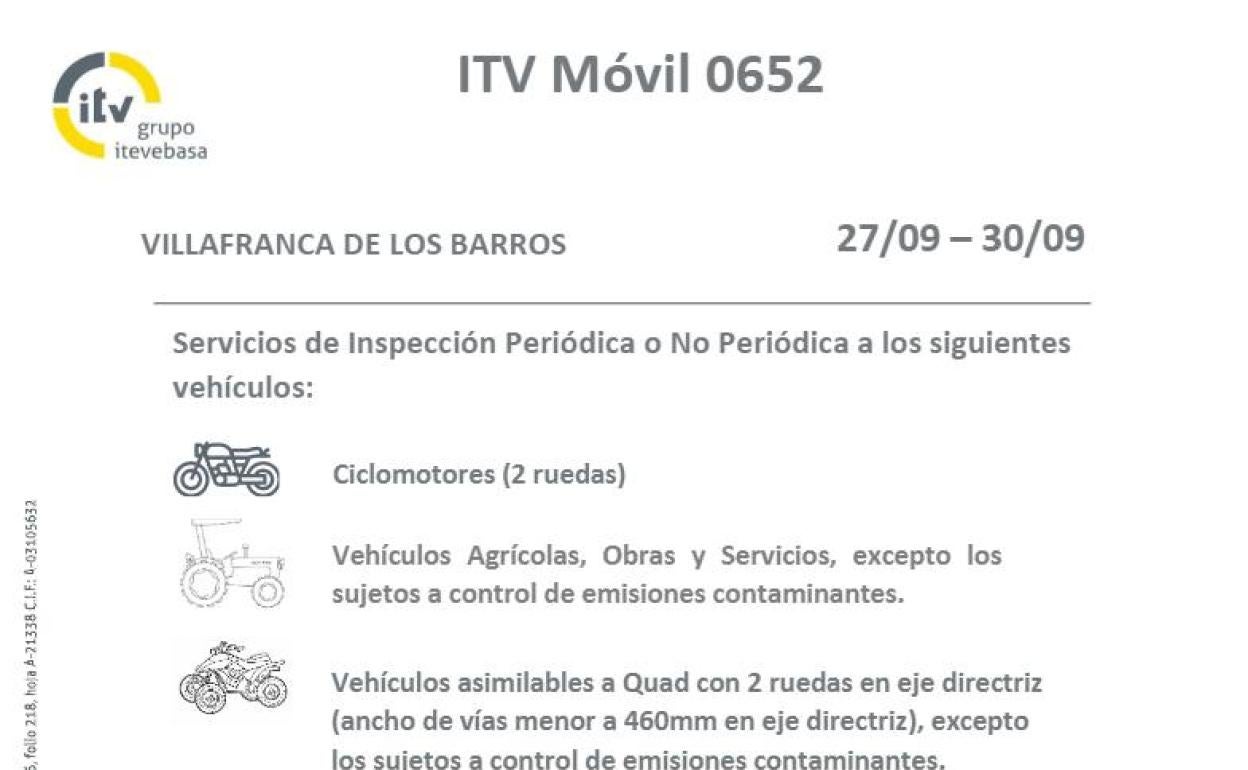 Del 27 al 30 de septiembre de agosto, una Estación ITV Móvil volverá de nuevo a Villafranca de los Barros para prestar el servicio de inspección técnica a maquinarias agrícolas, de obras y servicios, ciclomotores y vehículos asimilables a quad.