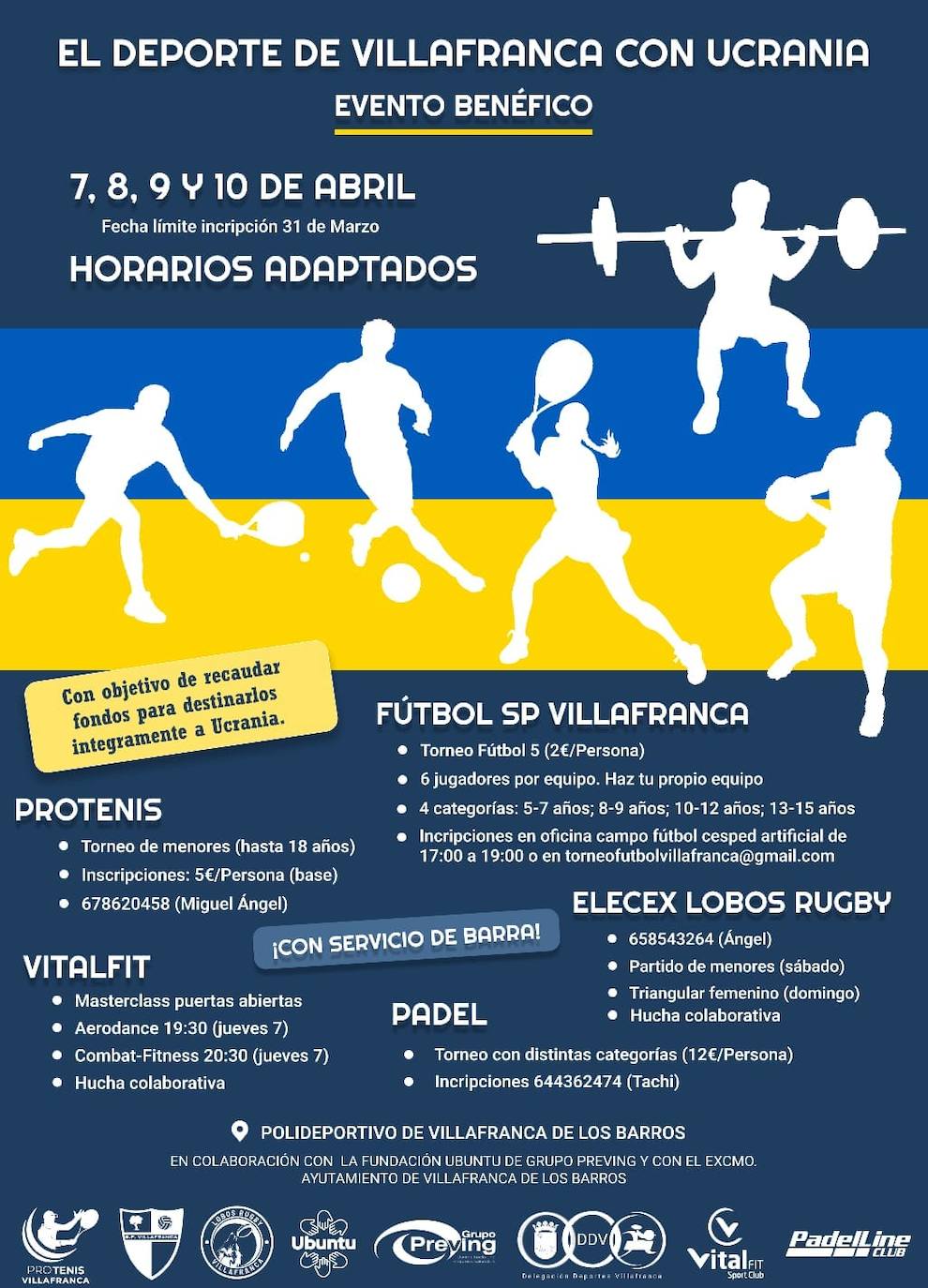 Los próximos 7, 8, 9 y 10 de abril el polideportivo de Villafranca de los Barros será la sede del evento benéfico «El deporte de Villafranca con Ucrania». Habrá torneos de tenis, pádel, rugby, fútbol y masterClass. El objetivo, animar a la población villafranquesa a que se sume a este evento benéfico donde todo lo que se recaude irá destinado a Ucrania. Las inscripciones para poder participar en las diferentes modalidades deportivas se podrá hacer hasta el 31 de marzo a través de los teléfonos que aparecen en el cartel (se adjunta al final de la noticia).