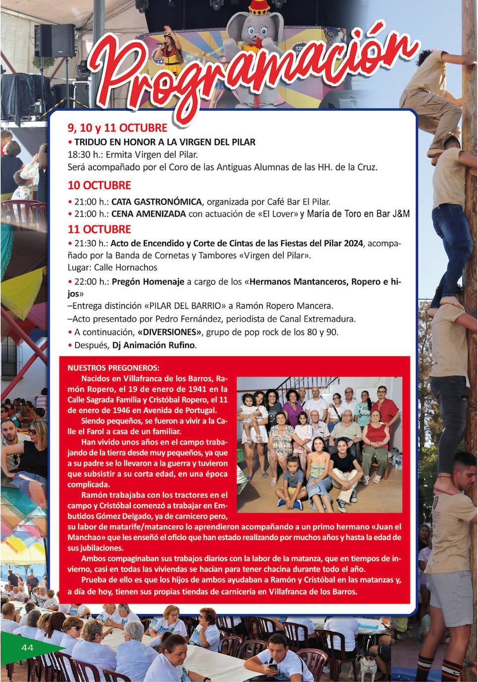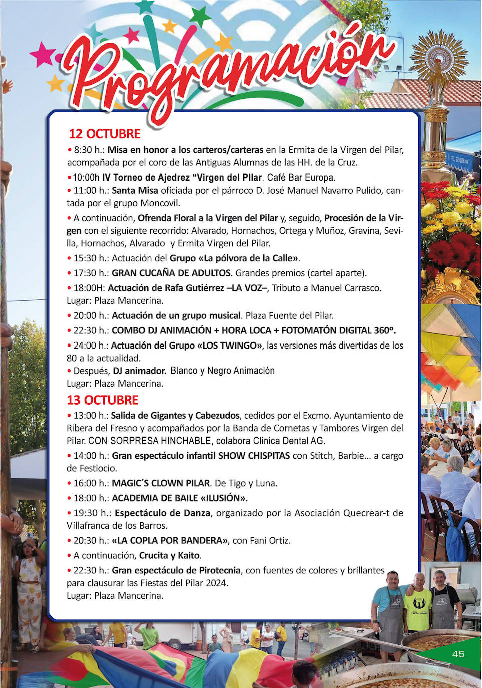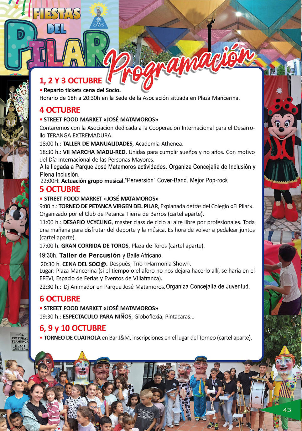 Ya se conoce el programa de actos para estas Fiestas del Pilar 2024 «somos barrio» que se desarrollará en la localidad del 11 al 13 de octubre, aunque hay actividades previas a esta fecha como es la cena-convivencia del socio que tendrá lugar el sábado, 5 de octubre, en la Plaza Mancerina a partir de las 20.30 horas. En un inicio se espera congregar a más de 700 personas. El reparto de tickets se realizará los días 1, 2 y 3 de octubre en la sede de la asociación de 18.00 a 20.30 horas.