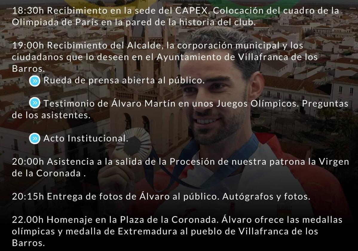 El llerenense y atleta del Club Atletismo Perceiana Extremadura (CAPEX), Álvaro Martín Uriol, doble medallista olímpico en París, recibirá su Medalla de Extremadura, y mañana, 8 de septiembre, estará en Villafranca de los Barros para recibir el calor de los vecinos.