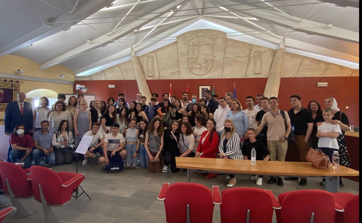 37 alumnos y profesores de Lituania, Grecia, Rumanía, Portugal y Turquía, así como alumnos y profesores del IES Meléndez Valdés, se han congregado en la mañana de hoy en el salón de plenos del Ayuntamiento de Villafranca de los Barros para celebrar un acto institucional junto a la corporación municipal por motivo del Día de Europa, que se celebra hoy, 9 de mayo.