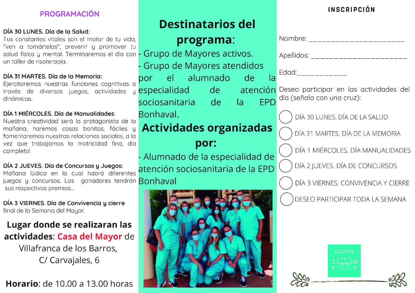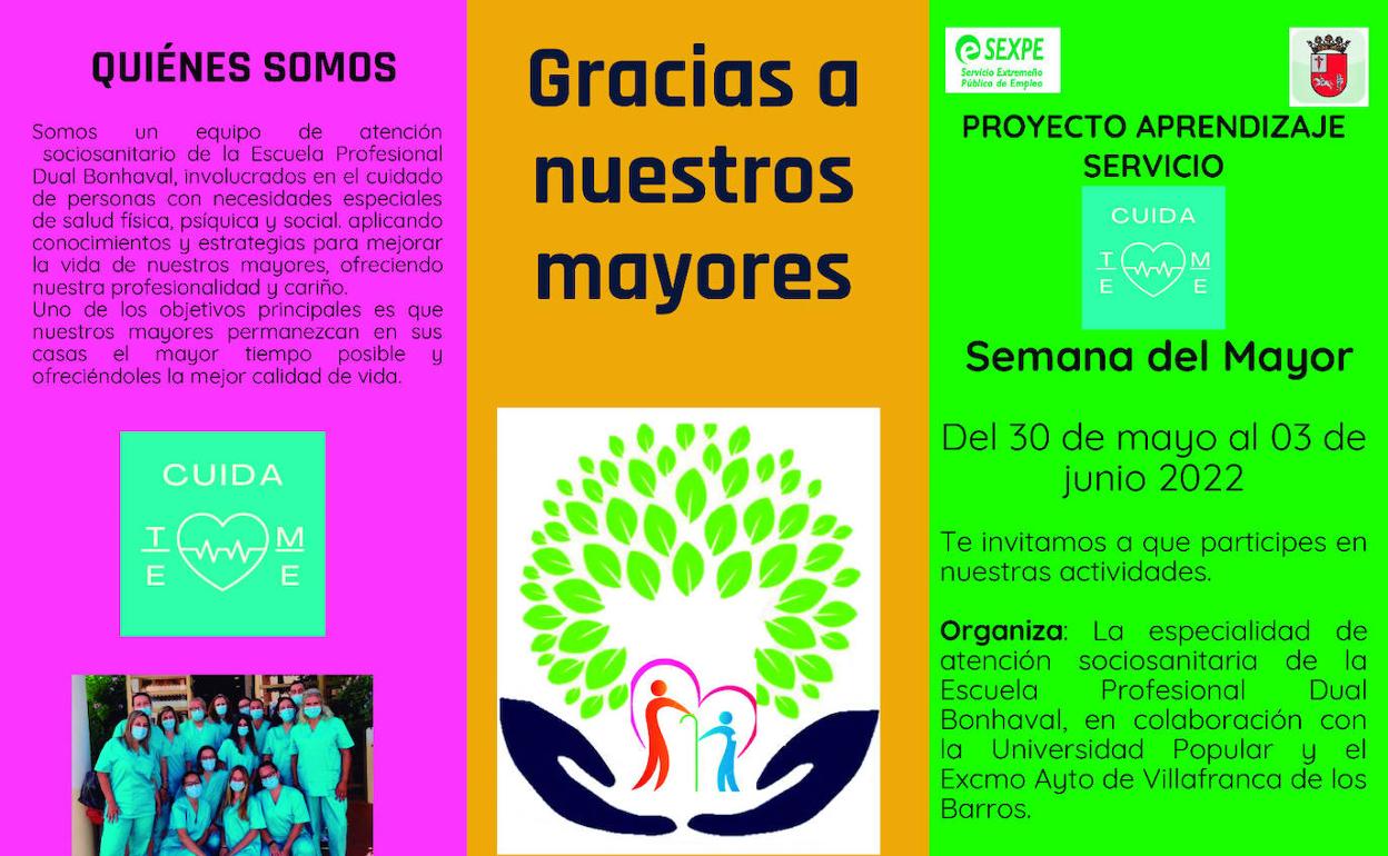 Actividades que organiza la especialidad de atención sociosanitaria de la Escuela Profesional Dual Bonhaval, en colaboración con la Universidad Popular y el Ayuntamiento de Villafranca, y orientada al grupo de mayores activos, y al grupo de mayores atendidos por el alumnado de la especialidad de atención sociosanitaria, previa inscripción.