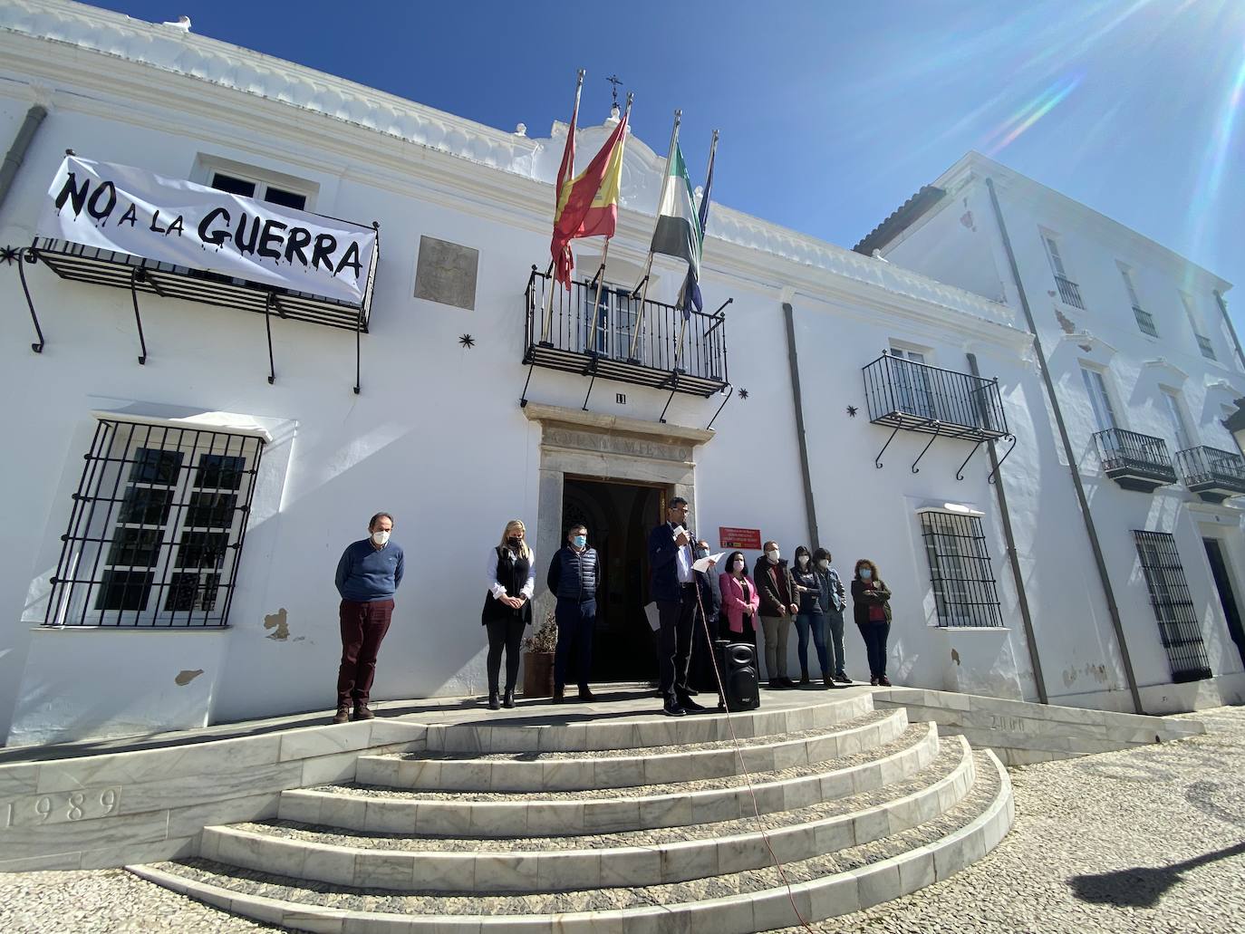El Ayuntamiento de Villafranca de los Barros luce desde hoy en uno de sus balcones una gran pancarta en la que se puede leer «No a la guerra».