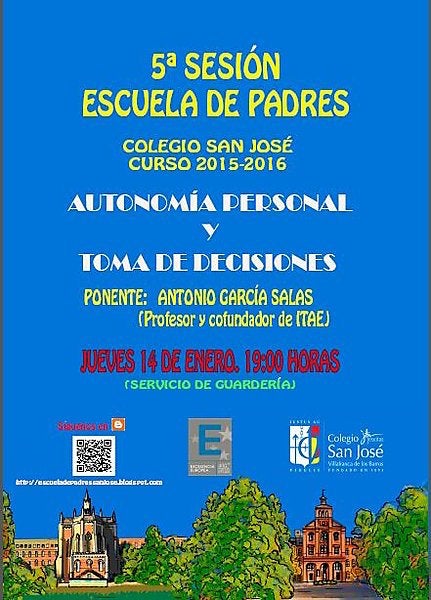 Será el proximo jueves, día 14 de enero, y será ya la quinta sesión de este curso. Se ha querido dar un matiz especial al estar programada en los días en que el Colegio acoge las jornadas de orientación académica para alumnos de Bachillerato. En ese sentido, la Escuela de Padres contará con la presencia de Antonio García Salas, profesor y cofundador de la Escuela de Negocios ITAE, que abordará el tema "LA AUTONOMÍA PERSONAL Y LA TOMA DE DECISIONES".