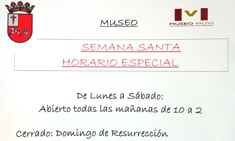 Durante Semana Santa (21-26 marzo) el Museo Histórico y Etnográfico de Villafranca de los Barros tendrá horario especial, ya que abrirá todos los días ... de 10 a 14 horas. El Museo mantendrá sus puertas cerradas el próximo día 27 de marzo, Domingo de Resurrección.