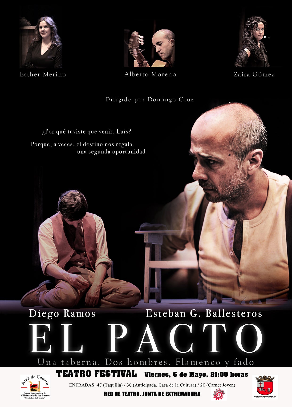 El Teatro Cine Festival acoge esta noche la representación teatral de la obra "El pacto", una fusión de flamenco, fado y teatro a cargo de ... Desván Teatro y bajo la dirección de Domingo Cruz. Esta obra está encuadrada dentro de la Red de Teatro de la Junta de Extremadura.