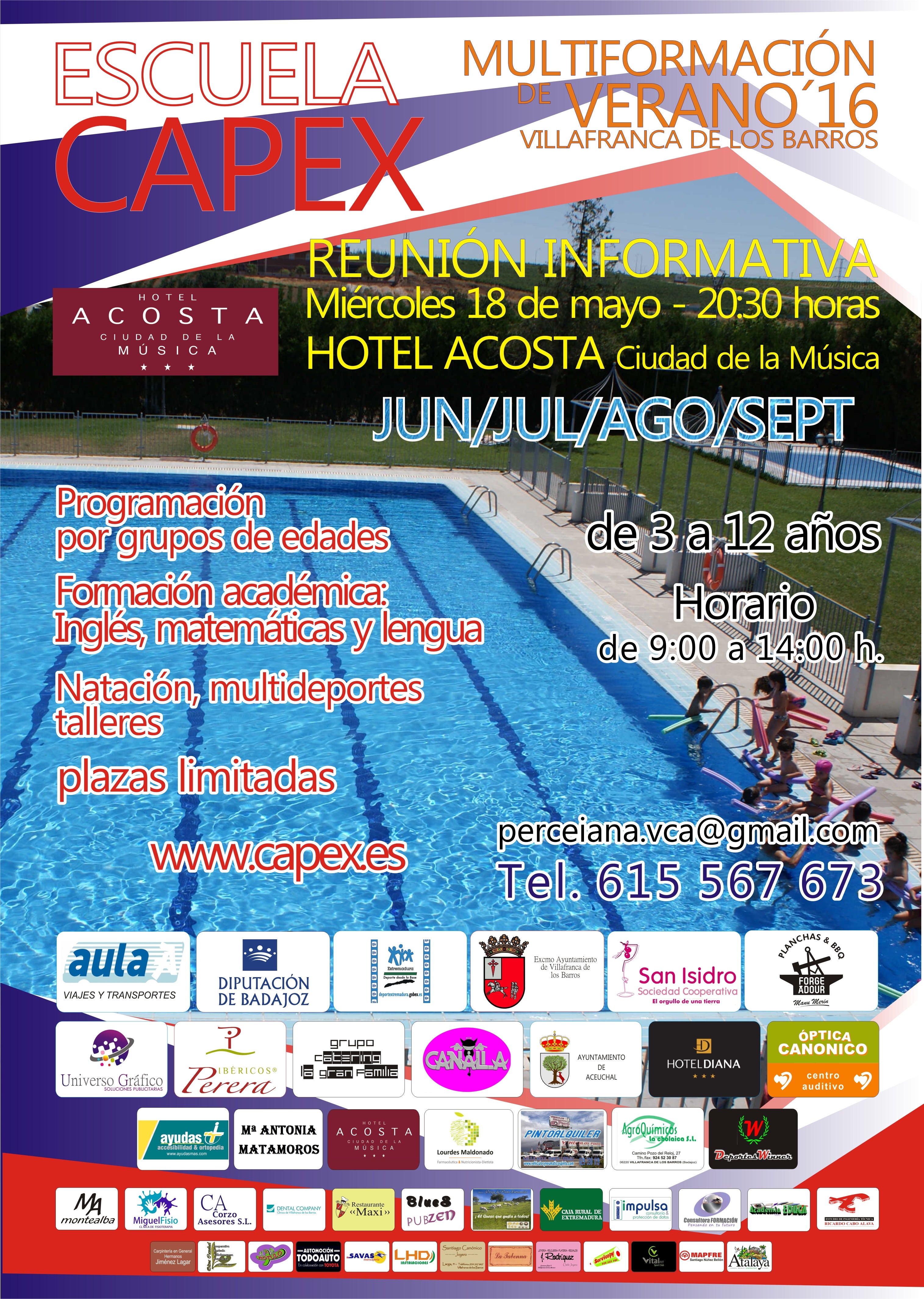 Un año más el CAPEX pone en marcha su ya tradicional Escuela Multiformación Verano16, dirigida a niños y niñas de 3 a 12 años, con ... un horario que se extiende de 9 a 14 horas. Las plazas ofertadas son limitadas.