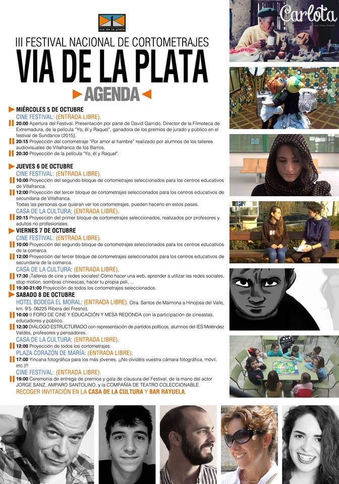 Mañana miércoles, 5 de octubre, a partir de las 20 horas, arranca en el Cine Festival de Villafranca de los Barros el III Festival Nacional de Cortometrajes Vía de la Plata', con un extenso programa de actividades que tendrá lugar los días 5, 6, 7 y 8 de Octubre. Un festival imprescindible por su labor educativa y su labor de promoción y difusión de la cultura audiovisual entre la juventud, que nació junto con el proyecto audiovisual Vía de la Plata con la finalidad de defender, promover y divulgar la cultura audiovisual entre la Infancia y la Juventud. El director de la Filmoteca de Extremadura, David Garrido, asistirá a la inauguración del festival, durante el que se presentará la primera película de esta edición Yo, él y Raquel.