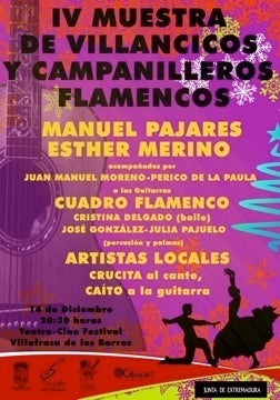 En la noche de hoy viernes, a las 2030 horas y en el Teatro Cine Festival, se celebrará la IV Muestra de Villancicos y Campanilleros ... Flamencos, que organiza la Junta de Extremadura con la colaboración de la Peña Flamenca Solera Extremeña y el Ayuntamiento de Villafranca.
