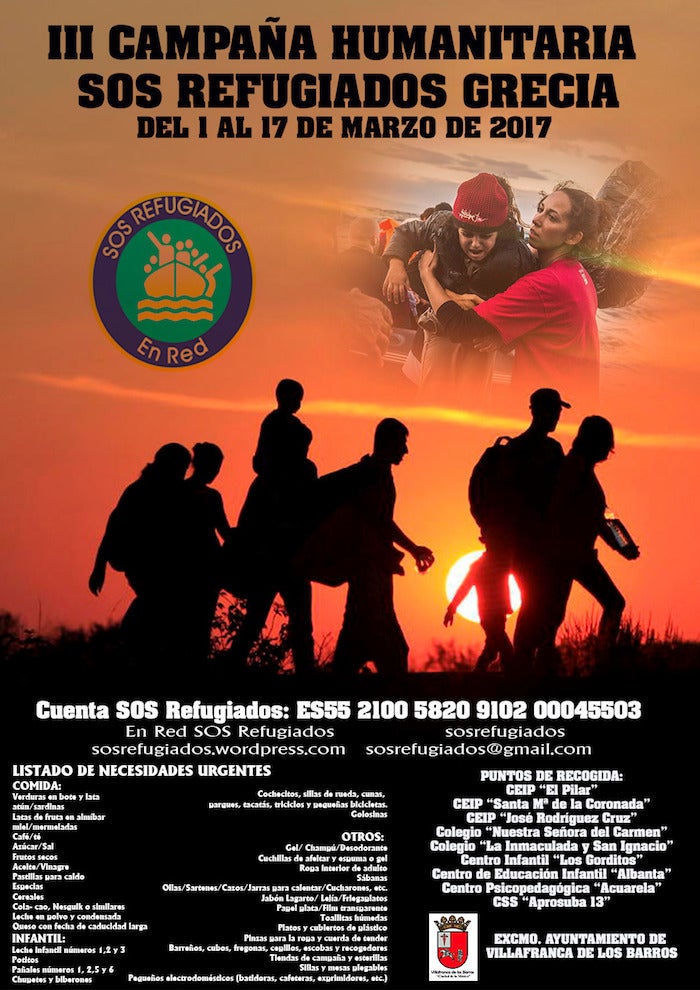 La Concejala de Servicios Sociales, Pilar Carrillo, ha dado a conocer el pasado viernes 24 de febrero el comienzo de la III Campaña Humanitaria SOS ... Refugiados Grecia, que se desarrollará del 1 al 17 de marzo, y a la que se ha adherido el ayuntamiento de Villafranca tras la propuesta de la trabajadora de Aprosuba 13, Eva García Caballero. Para el desarrollo de la campaña se ha solicitado la ayuda a los centros educativos, a los que se requiere comida no perecedera, alimentación infantil y material de higiene personal, aunque también otros objetos como pequeños electrodomésticos, cunas, cochecitos, parques de niños, sábanas, ropa interior..etc. Para el mejor funcionamiento de la campaña se ha agrupado las necesidades por centros.