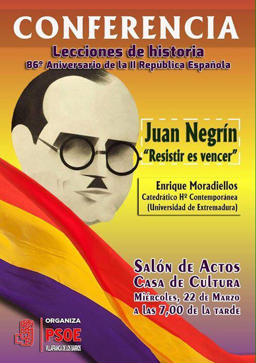 El próximo miércoles 22 de marzo tendrá lugar en el salón de actos de la Casa de la Cultura de Villafranca de los Barros, a ... partir de las siete de la tarde, una conferencia titulada 'Resistir es vencer' sobre la figura de Juan Negrín.