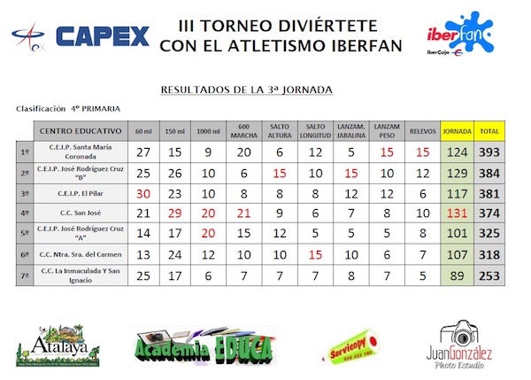El Colegio San José fue el mejor de la jornada tras sumar 131 puntos, destacando las victorias de los equipos de 150ml, 1000ml, 600m marcha y la individual de Rubén Castro en los 150ml. La sección A del Colegio Rodríguez Cruz venció en los 1000ml y las Carmelitas en salto de longitud (Javier Durán 3,40m).