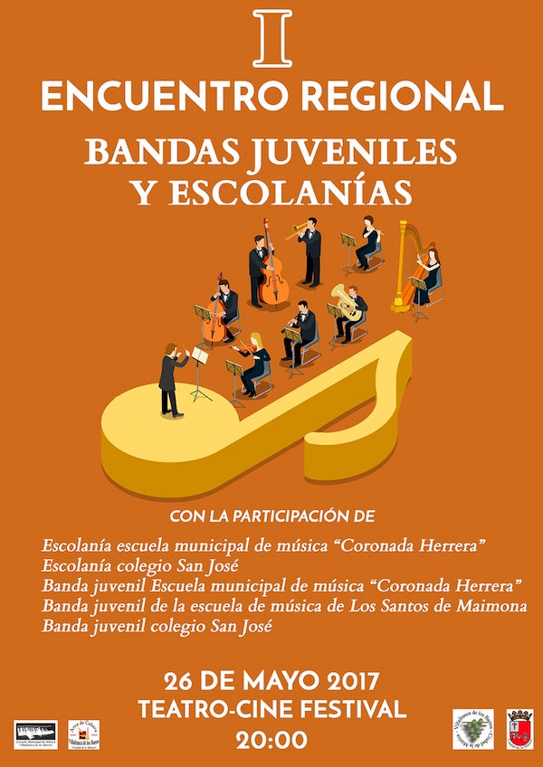 Y hablando de música, el próximo viernes, a partir de las 20 horas y en el Teatro Cine Festival, se celebrará el I Encuentro Regional de Bandas Juveniles y Escolanías, con la participación de la Escolanía de la EMM María Coronada Herrera de Villafranca de los Barros, la Escolanía del Colegio San José, la Banda Juvenil de la EMM María Coronada Herrera, la Banda Juvenil de la Escuela de Música de Los Santos de Maimona y la Banda Juvenil del Colegio San José.