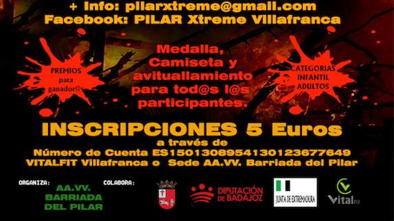 El día 14 de octubre se va a celebrar una experiencia única a partir de las 9 de la mañana con el 'I Pilar Xtreme Villafranca', con la recogida de dorsales en C/ Pedro Yuste Marzo (frente a Mercadona). Está previsto que la prueba dé comienzo a las 10 de la mañana. En cuanto a las bases de la prueba, estas figurarán en un cartel aparte.