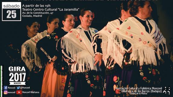 La Asociación Cultural y Folklórica Moncovil sigue con sus compromisos de 2017. En esta ocasión participará en la clausura de las jornadas culturales organizadas por ... la Casa Regional de Extremadura en Coslada. El acto tendrá lugar en el Teatro del Centro Cultural La Jaramilla de la madrileña localidad de Coslada a partir de las 19 horas el próximo sábado 25 de noviembre.