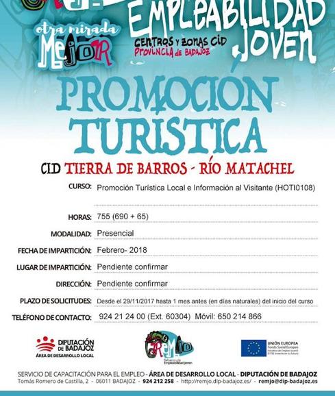 La primera oferta es un curso de Promoción Turística e Información al Visitante, que se impartirá en el mes de febrero en el CID en la modalidad presencial, con 755 horas de duración y cuyo plazo de inscripción ya está abierto