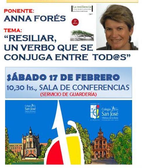 La doctora Anna Forés participará mañana sábado en el Colegio San José de Villafranca de los Barros para hablar de 'la Resiliencia' en la Jornada ... Educativa de la Escuela de Padres correspondiente al curso 2017/18, que patrocina la AMPA del Colegio. La sesión comenzará a las 10,45 horas de la mañana. El tema de la conferencia es: 'Resiliar, un verbo que se conjuga entre tod@s'.