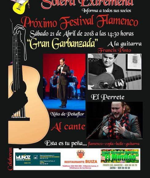 El próximo sábado 21 de abril, la sede de la Peña Cultural Flamenca Solera Extremeña celebrará el Día del Socio con un espectaculo flamenco y ... una garbanzada. La comida dará comienzo a las 14:30 horas con una garbanzada gratis para todos los asistentes. Los socios pueden acompañarse de una pareja de amigos (a excepción de aquellos socios que se hayan dado de baja en los últimos años), y se permite la entrada a niños de cualquier edad.