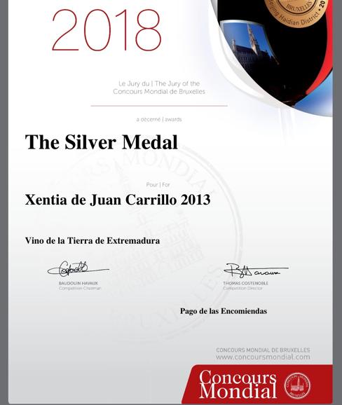 El vino XENTIA añada 2013, de Pago de las Encomiendas, Medalla de Plata en el certamen internacional Concours Mondial de Bruxelles