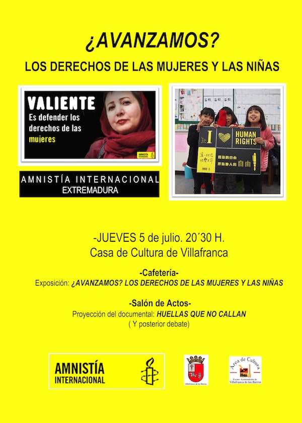 Por parte de Amnistía internacional Extremadura intervendrá Inmaculada González Clemente. UNRWA España. El acto se divide en dos partes: a las 20,30 horas, en la cafetería de la Casa de la Cultura se inaugurará la exposición "¿Avanzamos? Los derechos de las mujeres y las niñas". A continuación, en el salón de actos se producirá la proyección del documental "Huellas que no callan", para terminar con un debate que profundizará en dicha temática.