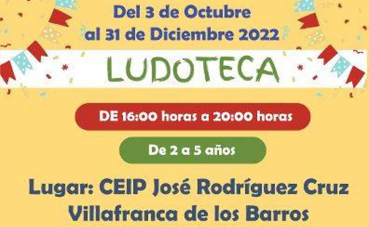 El programa de Ludotecas Rurales de la Junta de Extremadura comenzará en Villafranca de los Barros este mes de octubre y durará hasta finales de año con el nombre de «PEKEBARROS». Es un servicio gratuito dirigido a menores de 2 a 5 años para facilitar la conciliación laboral y familiar de las familias. El horario será de 16.00 a 20.00 horas de lunes a viernes y los sábados en horario de mañana de 9.30 a 14.00 horas los sábados. Las actividades se desarrollarán en las instalaciones del CEIP José Rodríguez Cruz, salvo los sábados que realizarán la actividad en la calle.