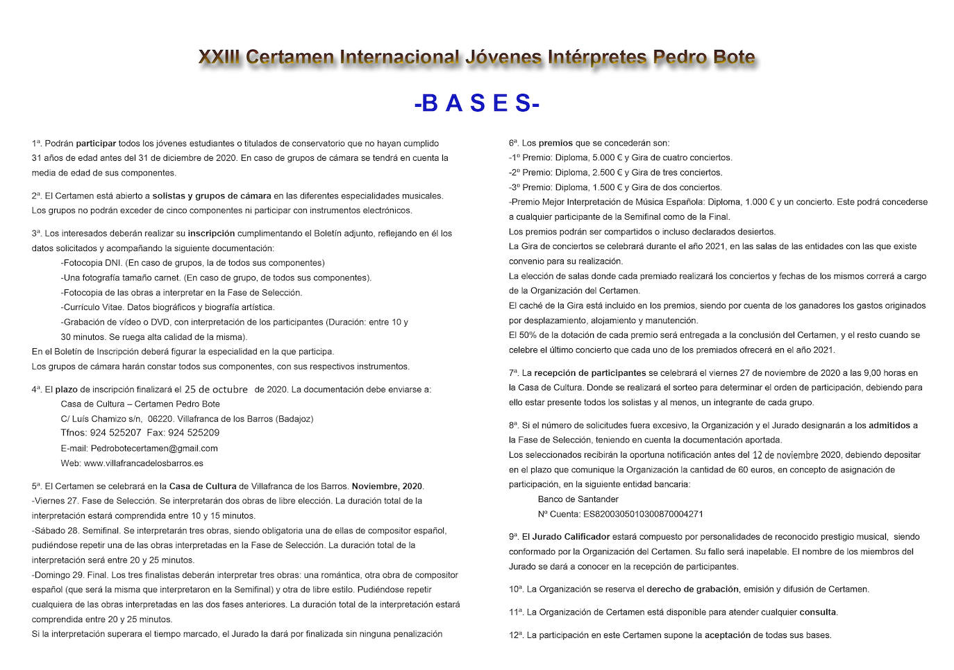 La XXIII edición del certamen «Pedro Bote» tendrá lugar los días 27, 28 y 29 de noviembre. El plazo de presentación de inscripciones se alarga hasta el 25 de octubre, con el fin de facilitar la participación de los músicos. Así mismo, los seleccionados recibirán la oportuna notificación antes del 12 de noviembre.