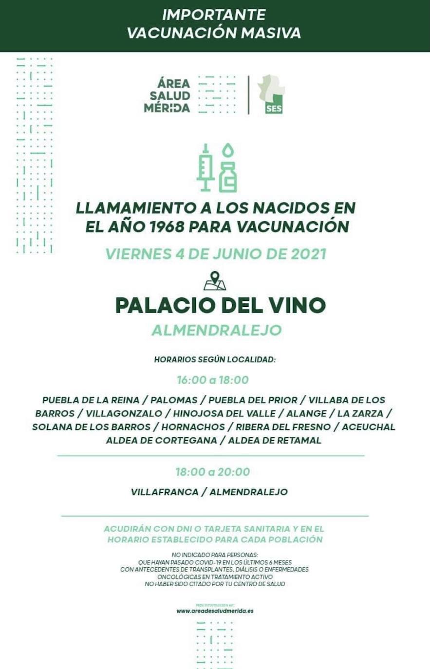 Desde el Área de Salud de Mérida se hace un llamamiento para los nacidos en el año 1968 para la vacunación contra el COVID-19. Los vecinos de Villafranca de los Barros podrán acudir el viernes 3 de junio de 2021 al Palacio del Vino de Almendralejo de 18:00 a 20:00 horas.