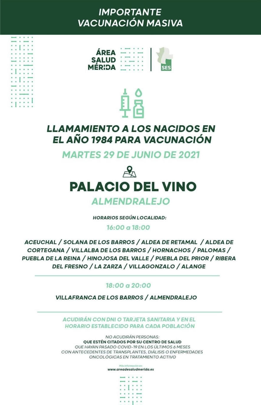 Desde el Área de Salud de Mérida se hace un llamamiento a los nacidos en el año 1984 para la vacunación contra el COVID-19. Los vecinos de Villafranca podrán acudir el día 29 de junio en el horario de 18:00 a 20:00 horas en el Palacio del Vino de Almendralejo.