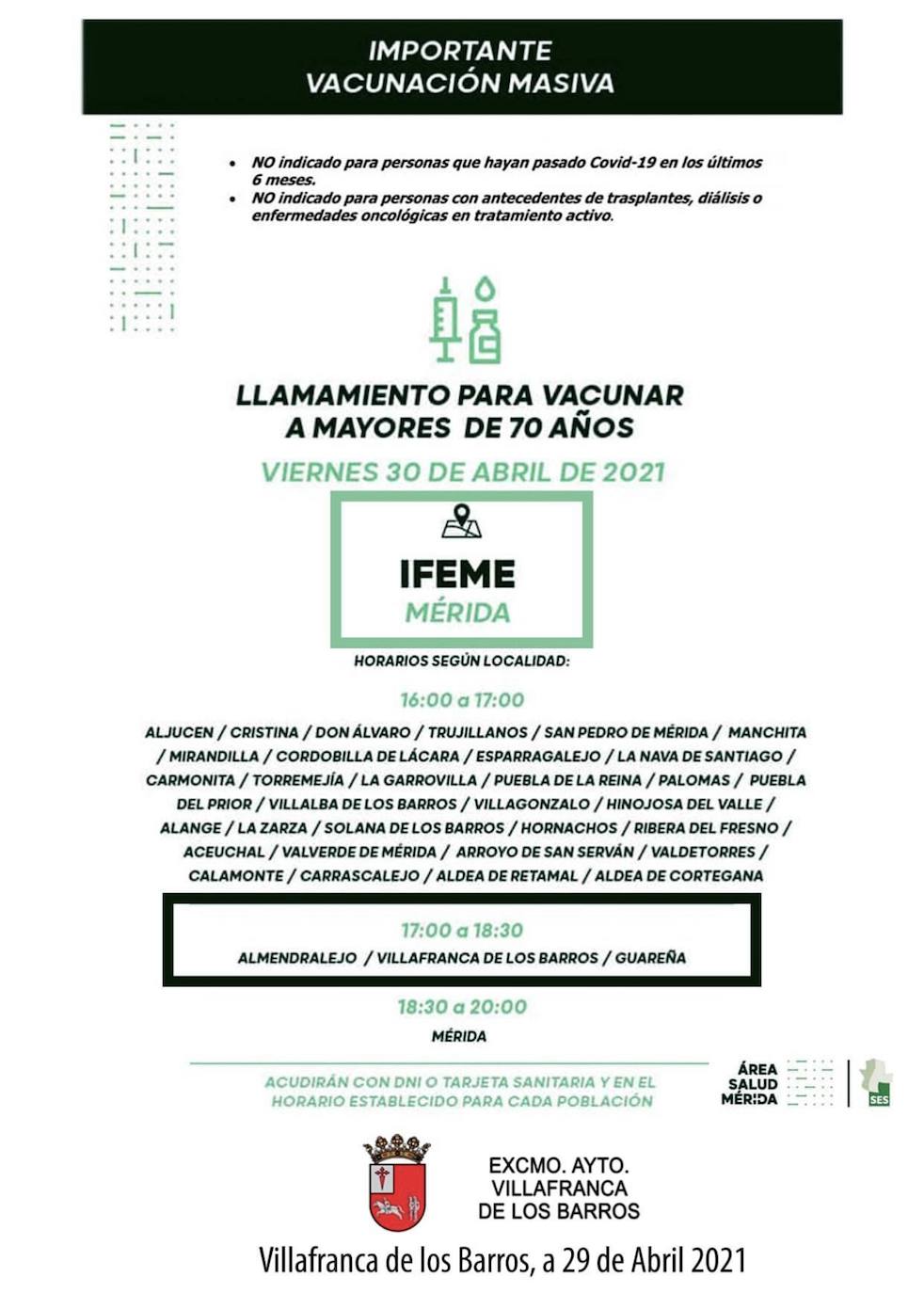 Desde el Área de Salud de Mérida se hace un llamamiento para vacunar a mayores de 70 años. Los ciudadanos de Villafranca se podrán vacunar el 30 de abril de 17:00 a 18:30 horas en Mérida.