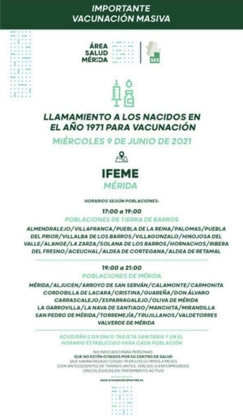 Desde el Área de Salud de Mérida se hace un llamamiento a los nacidos en el año 1971 para la vacunación contra el COVID-19. Los vecinos de Villafranca de los Barros podrán vacunarse el 9 de junio de 2021 de 17:00 a 19:00 horas en IFEME, Mérida.