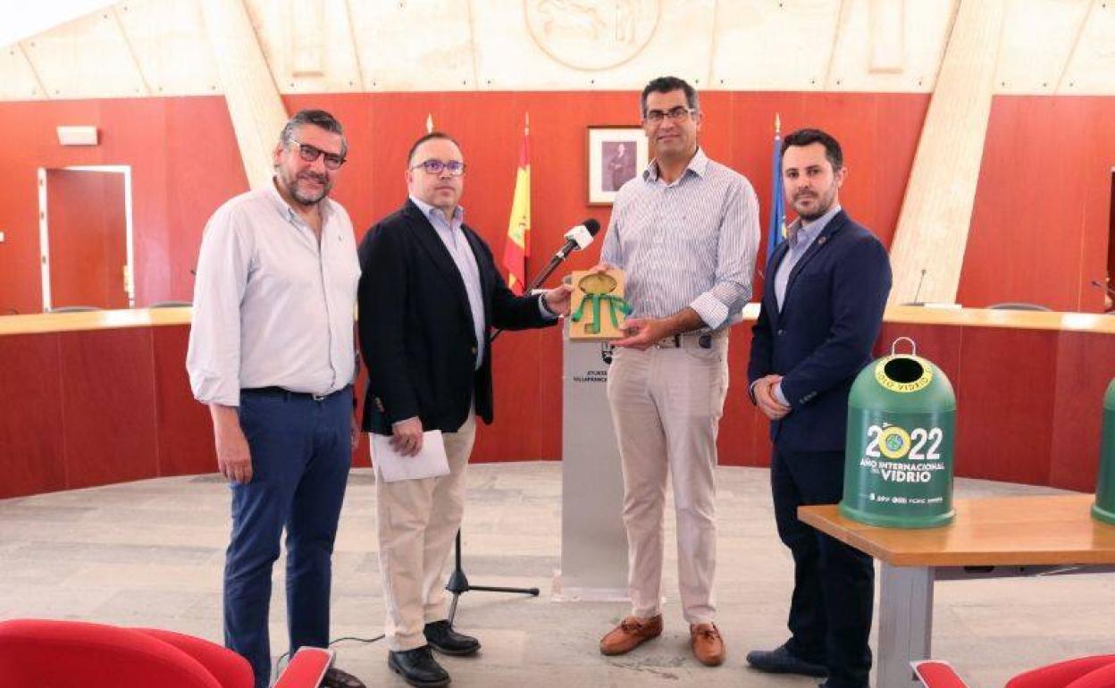 Villafranca de los Barros se une a la red de 'Municipios Hermanados por el Vidrio' y recibe su llave de este material, reciclado